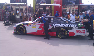 We had to be at AMS this morning at 9:30am to get started and it was an absolute blast!! Haylee played with other children that we knew from the AFLAC Cancer Center. It was nice getting the kids together outside of the hospital for a fun event. We got credentials to be in the infield since the game was played on a grassy area right at the entrance of pit road. After all waivers and releases were signed, they took us to the drivers meeting room to get organized by teams, get to know teammates, and wait for Jeff Gordon to arrive. Once he got there, he spoke to the crowd about what Kick It is and recognized the now 12 year old boy, Quinn, who created the foundation. He is a cancer survivor himself and also has MS. We had to wait around a bit because practice was going on on the track.